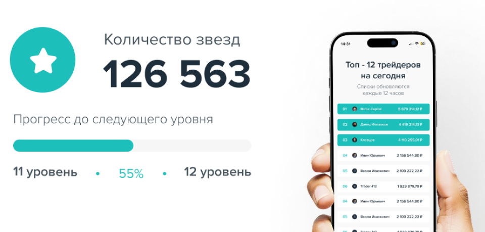 Звезды начисляются трейдерам за достижения: уровни, активность и результаты торговли. Их можно обменивать на товары: мерч, технику, бонусы, обучение и привилегии в системе. Чем больше прогресс — тем шире доступная витрина
